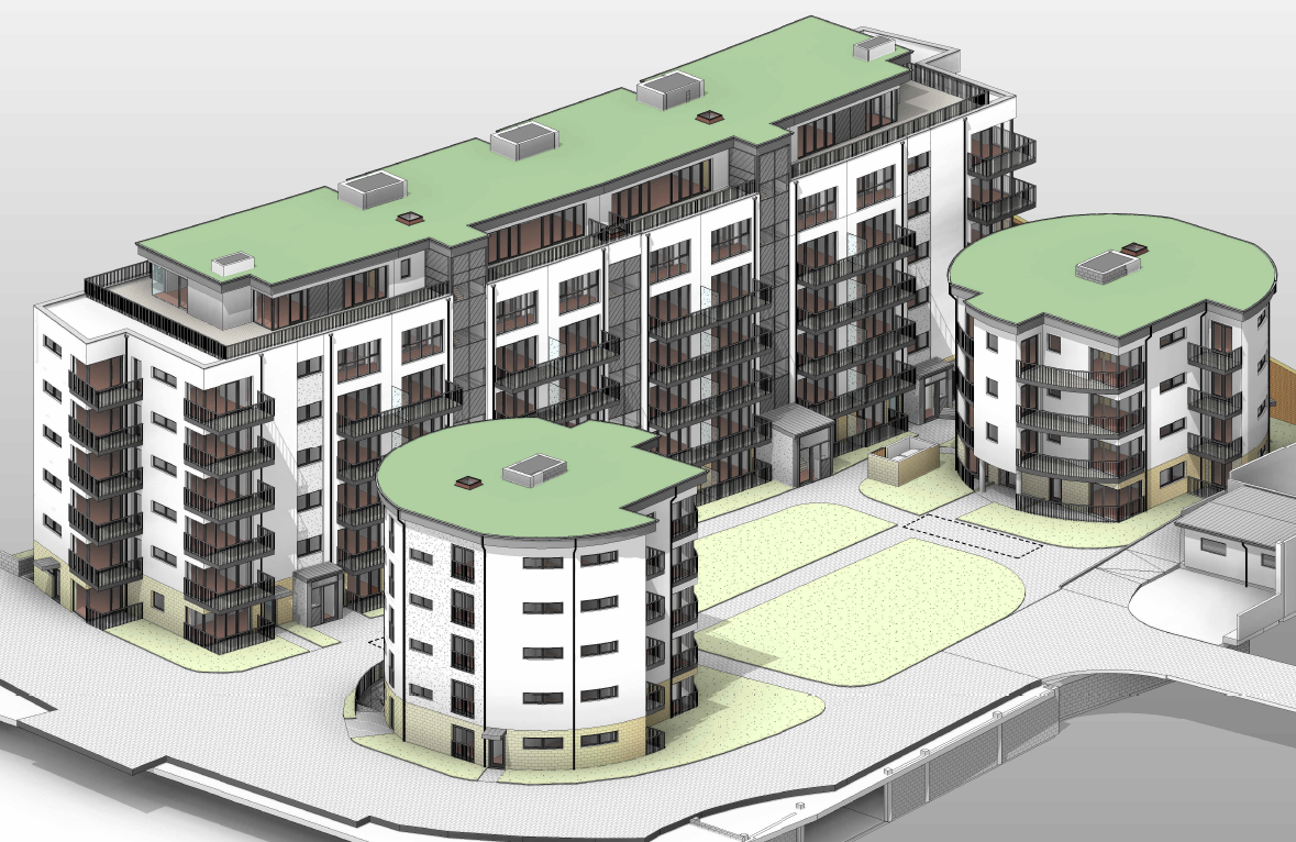 Trijų daugiaaukščių gyvenamųjų pastatų kompleksas su gelžbetoninių kolonų ir monolitinių gelžbetoninių perdangų laikančiąja sistema.